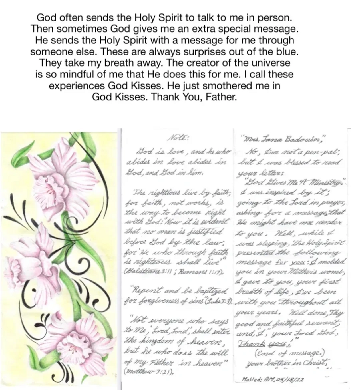 “… Dearest Sister Lana, you have made my heart so happy in a time of darkness in my life! I thank you so much. I am hoping to grow in the ministry of Christ and be able to help other people come to know Jesus as their Christ also…”